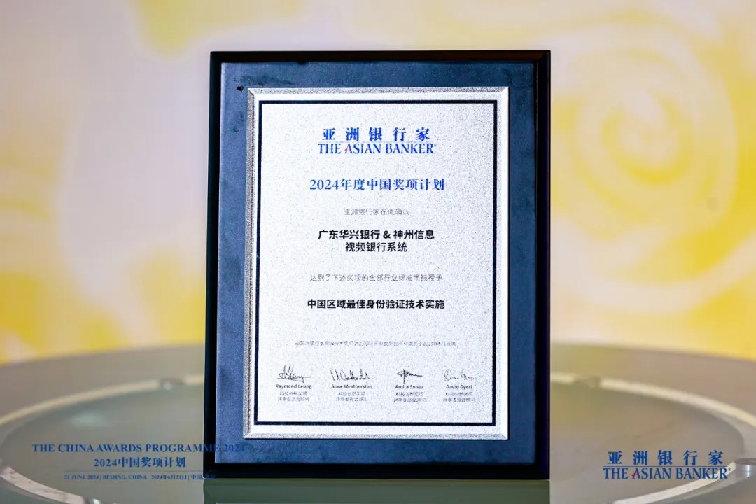 6月21日,亚洲银行家2024中国奖项计划颁奖典礼在北京举行,神州信息助力广东华兴银行打造的视频银行项目荣获“中国区域最佳身份验证技术实施”大奖。