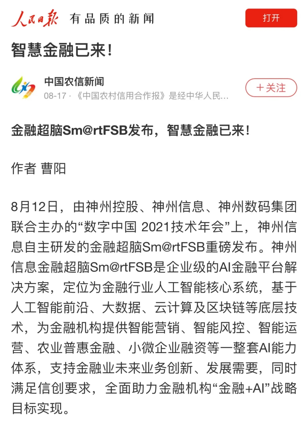 神州信息发布金融超脑Sm@rtFSB 构建金融AI核心系统