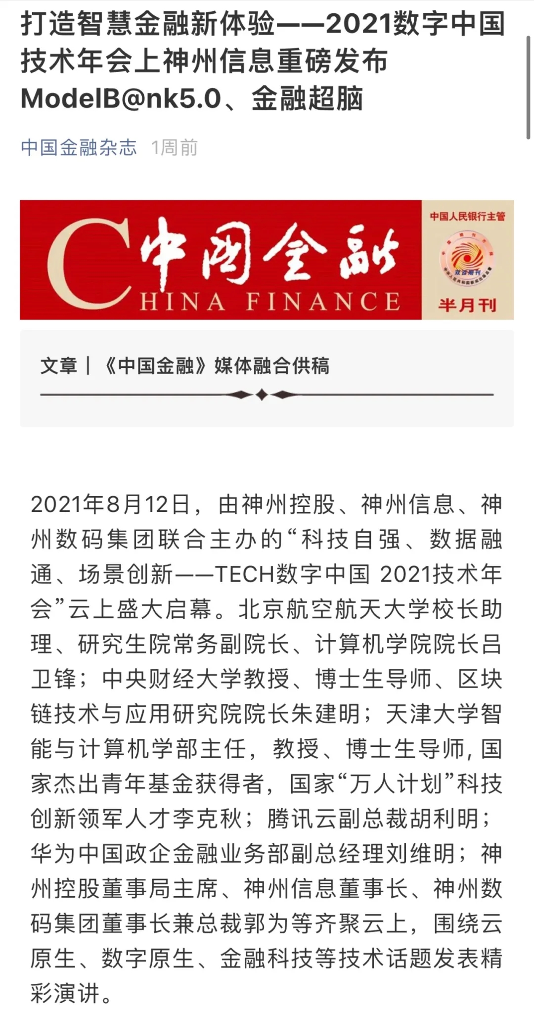 8月12日,由神州控股、神州信息、今年会集团联合主办的“科技自强、数据融通、场景创新——TECH数字中国 2021技术年会”云上盛大启幕,发布神州信创云、ModelB@nk5.0、金融超脑Sm@rtFSB、云原生数字化安全底座、园区智能体等重磅产品,国内各大权威、影响力媒体多角度多频次对盛况进行报道!