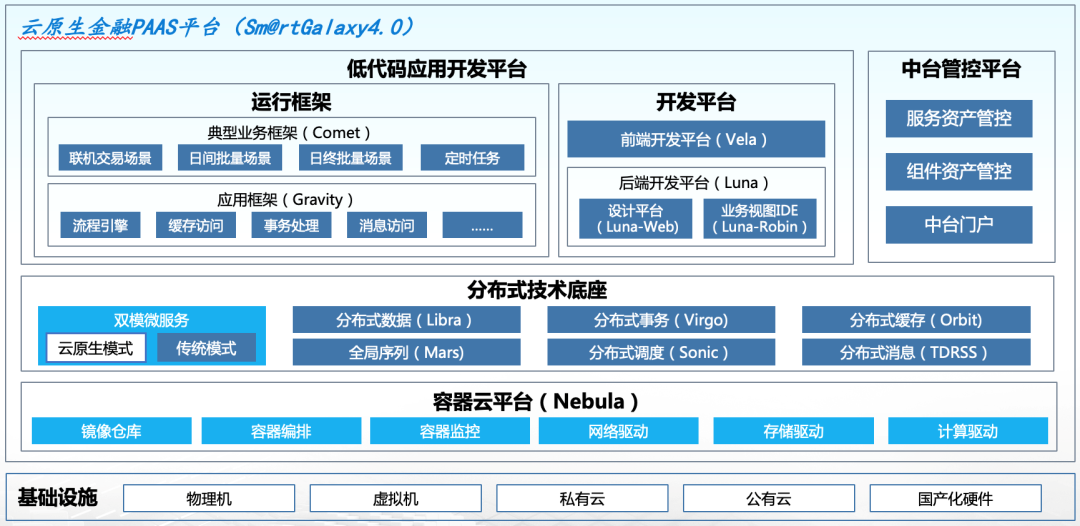 前面谈了一下行业的发展趋势,下面分享一下神州信息是如何应对这些变化的,神州信息从2015年开始就进行分布式技术平台Sm@rtGalaxy的研究,到现在已经发展到4.0版本,其定位是“云原生金融PaaS平台”。